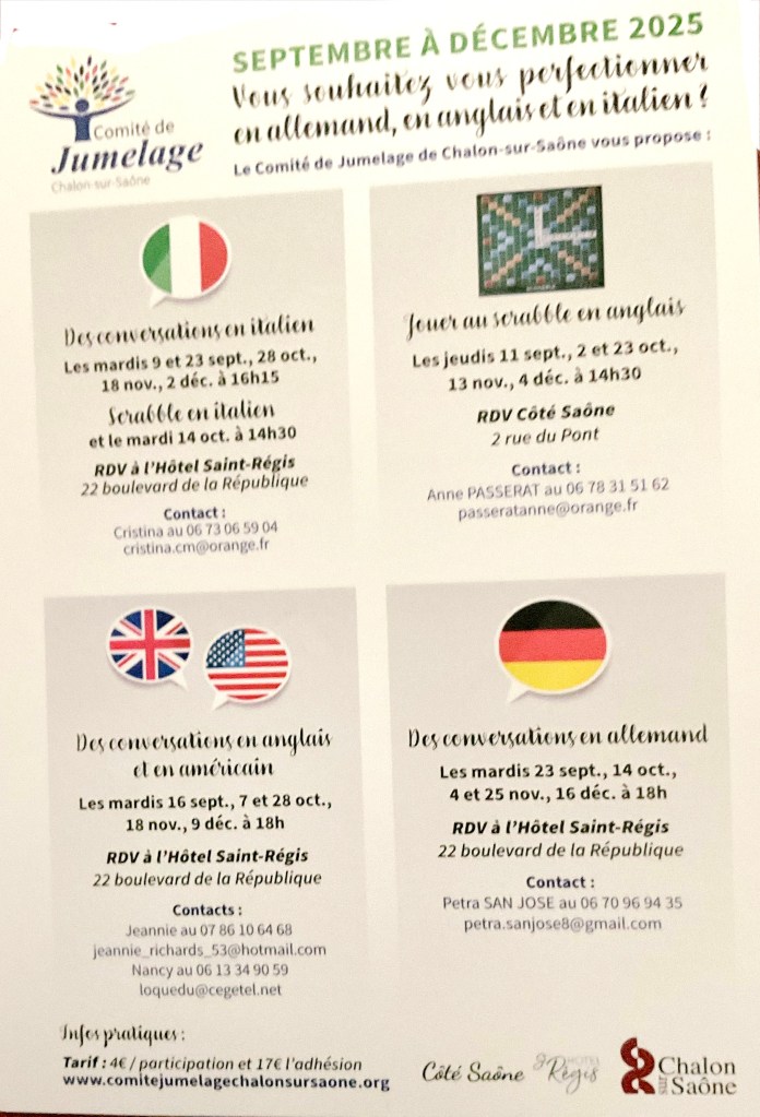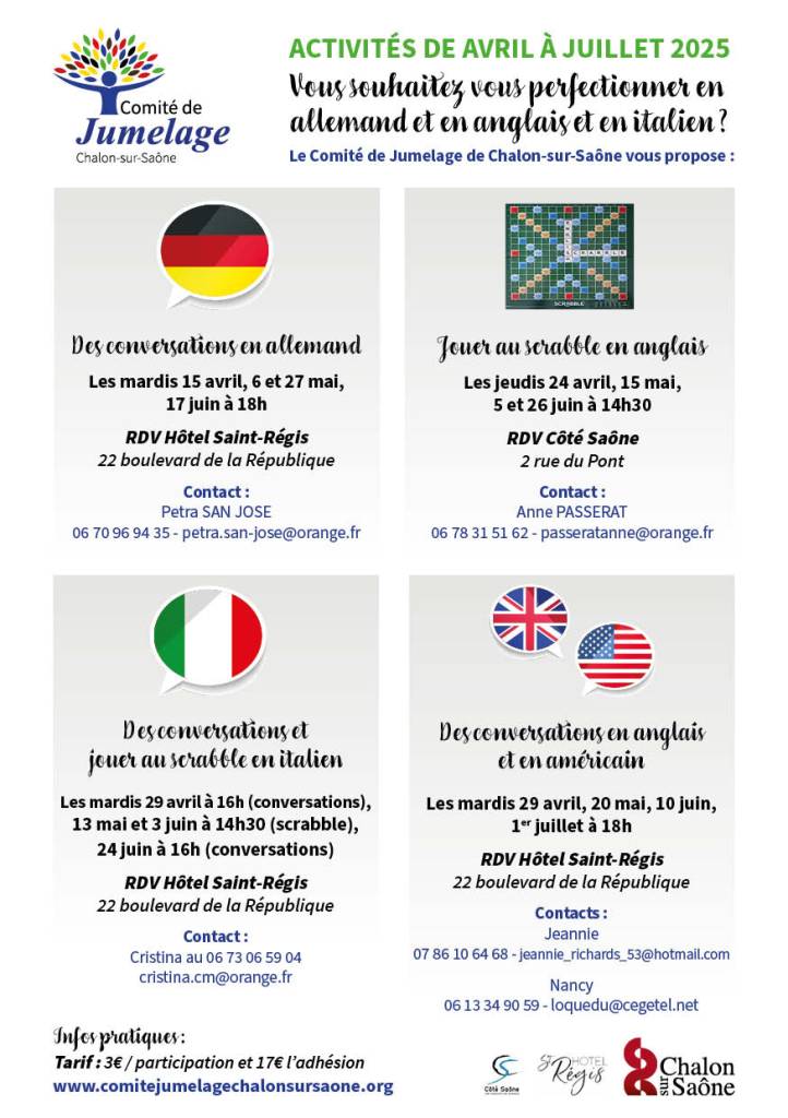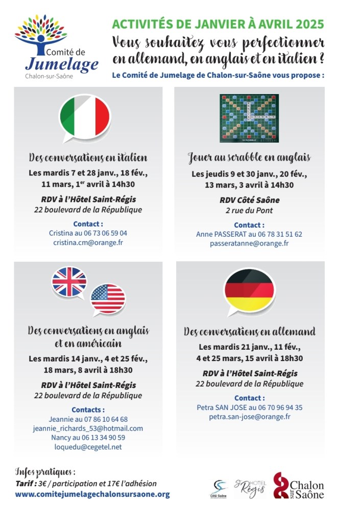 Le Comité de Jumelage de Chalon-sur-Saône vous souhaite de passer d’excellentes fêtes de fin d’année et a le plaisir de vous partager le programme des activités de janvier à avril 2025 ! Et si l’année prochaine votre bonne résolution c’était de vous perfectionner dans une langue étrangère de manière ludique et agréable ? 🇬🇧🇧🇪🇮🇹 Nous vous attendons nombreux 🤩