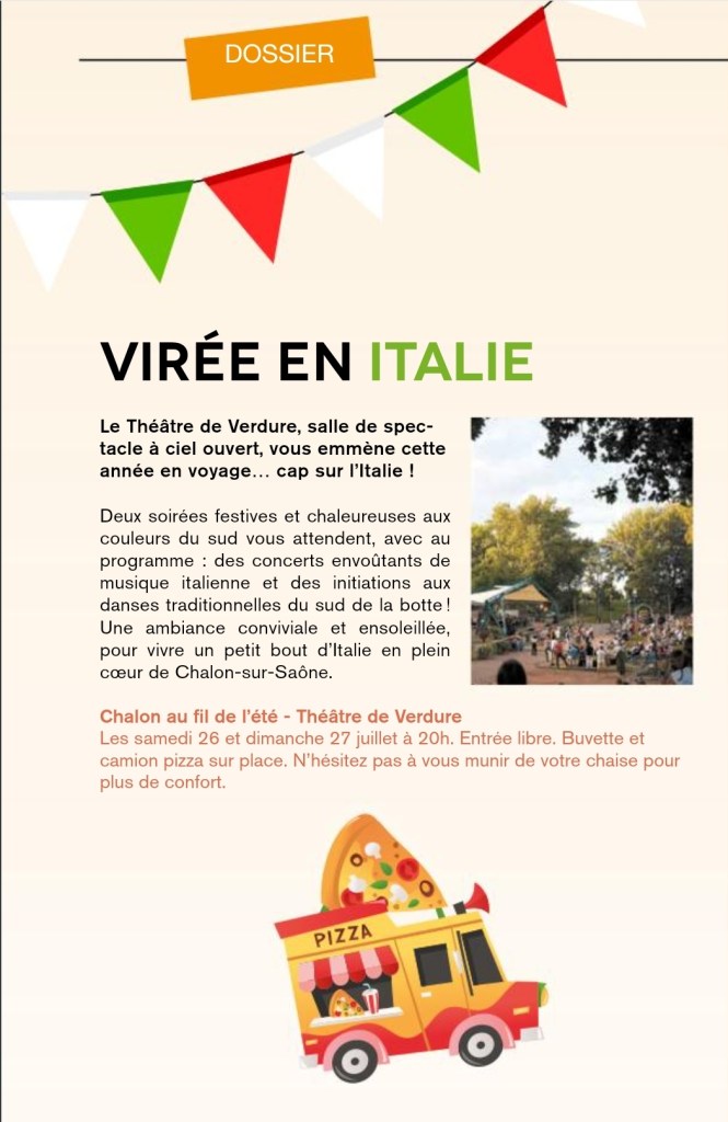 Un extrait du dernier Objectif Chalon n°57 pour vous faire part d’une jolie animation à venir sur le thème de l’Italie 🇮🇹 Rendez-vous les 26 et 27 juillet à 20h au Théâtre de Verdure !