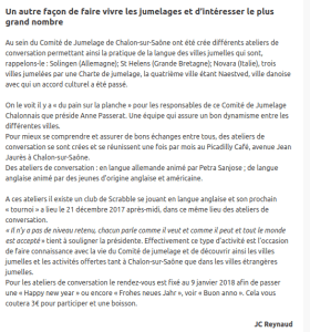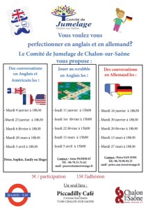Le Comité de Jumelage ne cesse d’étoffer son offre en direction de celles et ceux qui sont intéressé(e)s par la pratique des langues, mais sans cours, sans devoirs, juste en pratiquant (il parait que c’est le meilleur moyen pour apprendre).